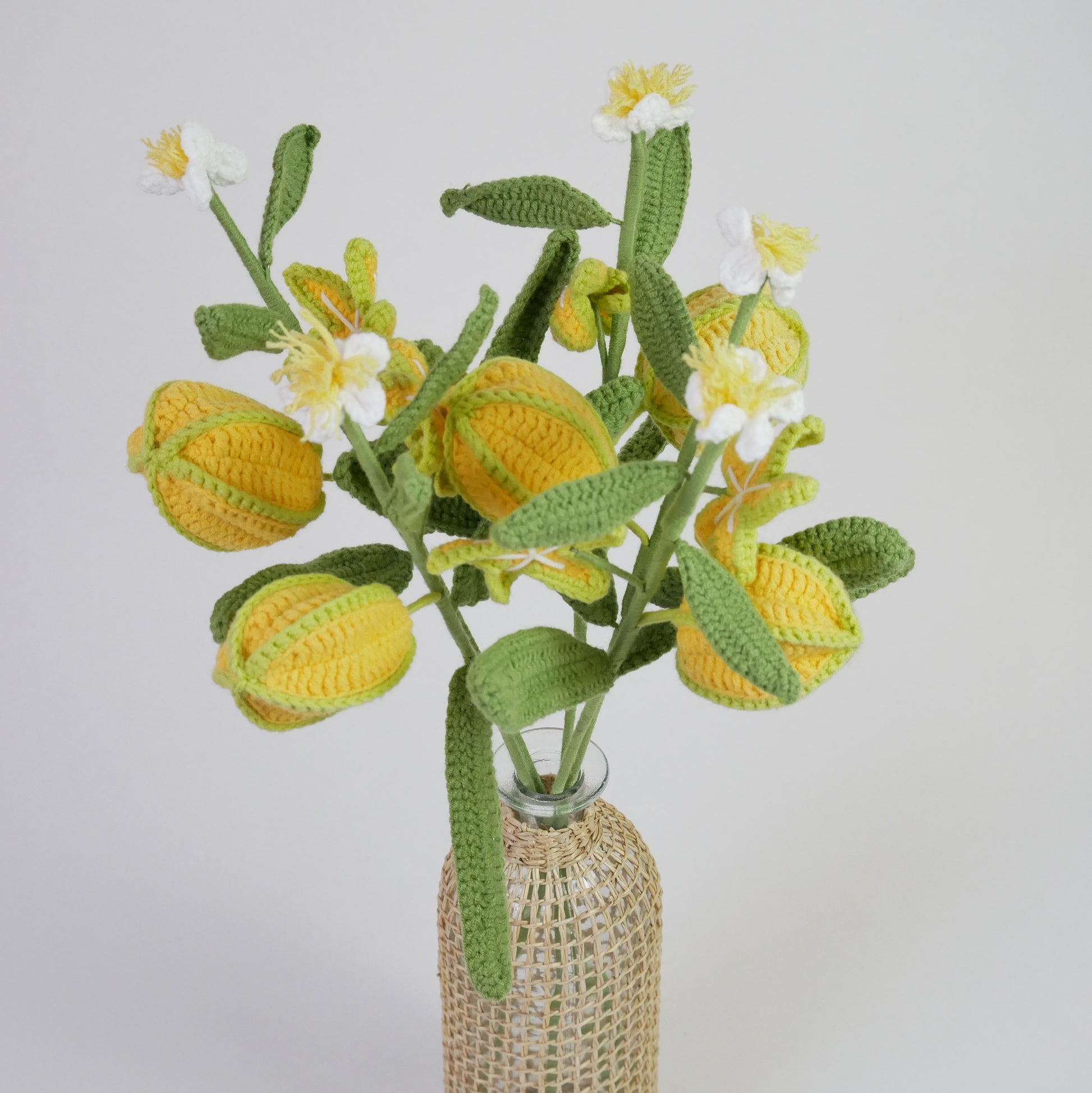 Tige de carambolier avec fruits et fleur éternelle au crochet, tricotée à la main. Pour la décoration de la maison ou du bureau.